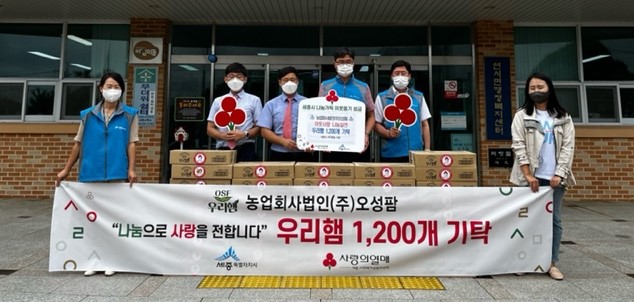 [세종타임즈] 세종특별자치시 연서면에 위치한 ㈜오성팜이 추석명절을 앞두고 31일 캔햄 50박스 1,200개를 연서면 지역사회보장협의체에 지정기탁했다.