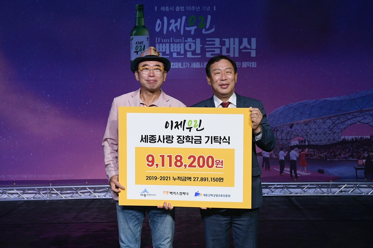 세종특별자치시는 지난달 31일 세종호수공원에서 개최한 ‘이제 우린 힐링 음악회-뻔뻔한 클래식 행사’에서 조웅래 ㈜맥키스컴퍼니 회장으로부터 세종사랑장학금을 기탁 받았다고 밝혔다.