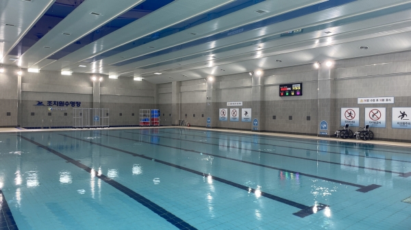 조치원 수영장은 내부에 메인풀 7레인, 유아풀, 체온유지풀을 갖추고 있다.