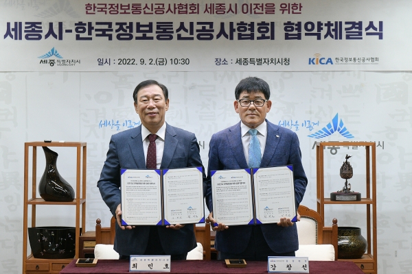 세종특별자치시는 2일 세종시청 접견실에서 최민호 시장과 강창선 한국정보통신공사협회 중앙회장이 참석한 가운데 ‘한국정보통신공사협회 세종시 이전 업무협약’을 체결했다고 밝혔다.