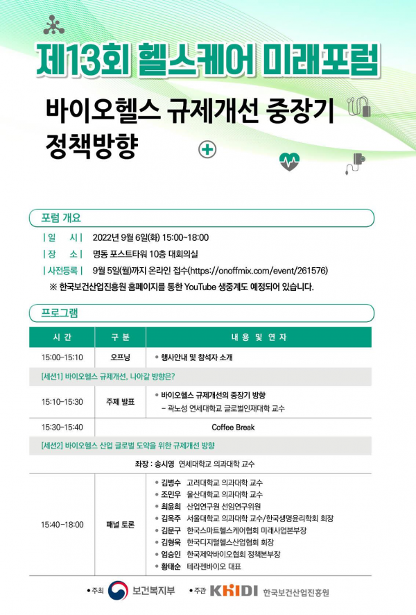 [세종타임즈] 보건복지부와 한국보건산업진흥원은 9월 6일 오후 3시 서울 포스트타워에서 ‘바이오헬스 규제개선 중장기 정책방향’을 주제로 ‘제13회 헬스케어 미래 공개토론회’를 개최한다고 밝혔다.