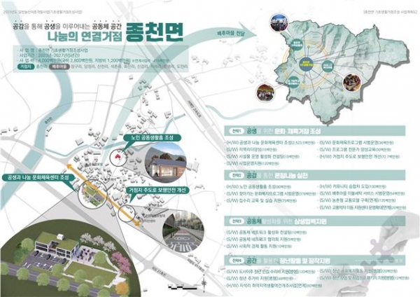 구체적으론 공생과 문화·체육시설인 나눔 문화체육센터와 노인공동생활홈을 조성해 주민 삶의 질을 증진시키고 보행사고가 잦은 종천면 주도로에 인도를 개설해 보행 안전 환경을 개선시킬 계획이라고 전했다.