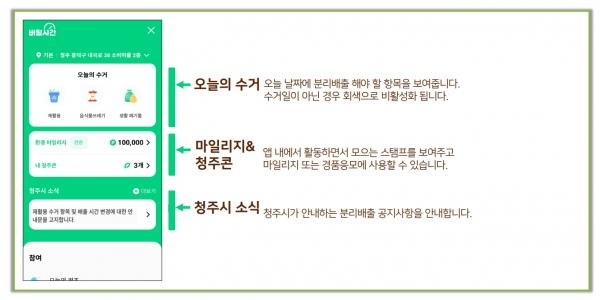 ‘버릴시간’은 청주페이 어플을 통해 접속해 쓰레기 수거시간, 올바른 배출방법 등을 재미있고 쉽게 알려주고 참여하는 시민들에게 다양한 인센티브를 지급하는 청주페이 부가 서비스다.