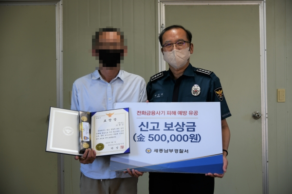 [세종타임즈] 세종남부경찰서는 전화금융사기 범죄 현금 수거책 검거에 기여한 택시기사 A씨에게 9월 7일 표창장과 보상금을 전달했다.