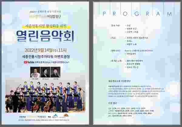 음악회는 ㈜세종아트컴퍼니 대표인 구병래 지휘자의 지휘 아래 관내에서 활동 중인 세종벨라보체여성합창단과 한국가곡 및 민요 등 다양한 공연이 계획 중이며 세종벨라보체여성합창단은 정기연주회, 나눔음악회, 수변음악회 등 합창음악을 통해 지역사회에 봉사하고 세종시 문화예술 발전에 이바지하는 단체이다.