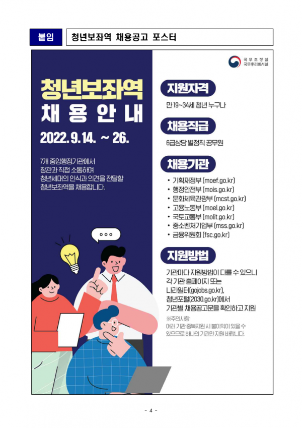 [세종타임즈] 정부는 오늘부터 7개 중앙행정기관에서 활동할 청년보좌역 채용절차를 시작한다.