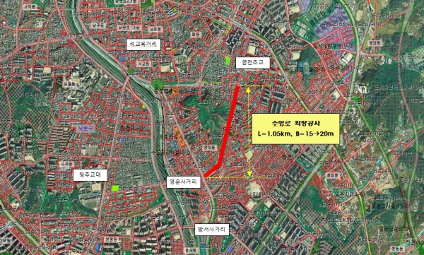 청주시는 금천새마을금고부터 영운사거리까지 약 1km의 도로 폭을 20m로 확장하는 수영로 확장공사 추진을 위해 9월 19일부터 10월 4일까지 보상계획 공고를 실시한다.