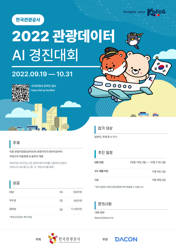 [세종타임즈] 한국관광공사는 관광분야 공공데이터를 활용한 AI 알고리즘 개발을 위한 ‘2022 관광데이터 AI 경진대회’를 오늘부터 10월 31일까지 국내 최대 데이터분석 플랫폼인 데이콘에서 온라인으로 진행한다.
