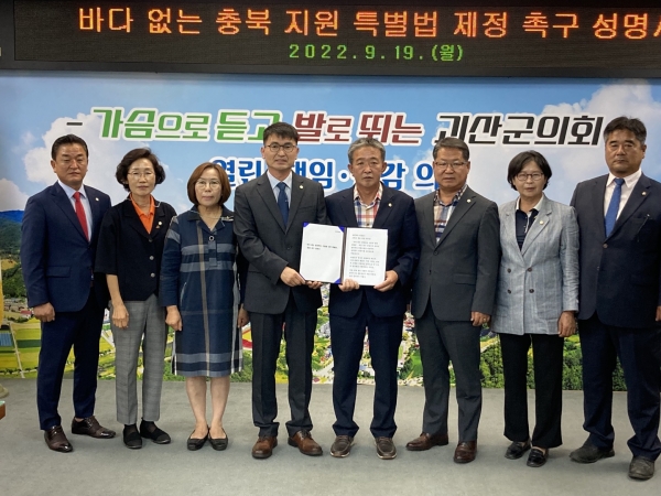 [세종타임즈] 충북 괴산군의회는 지난 19일 제313회 임시회 제1차 본 회의에서 ‘바다 없는 충청북도 지원에 관한 특별법’의 제정을 촉구하는 성명서를 채택했다.