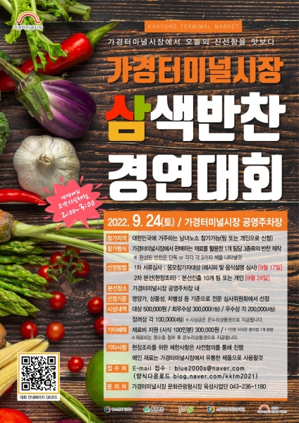 [세종타임즈] 청주시는 24일 오전 10시부터 가경터미널시장 주차장 일원에서 ‘가경터미널시장 삼색반찬 경연대회’가 진행된다고 밝혔다.