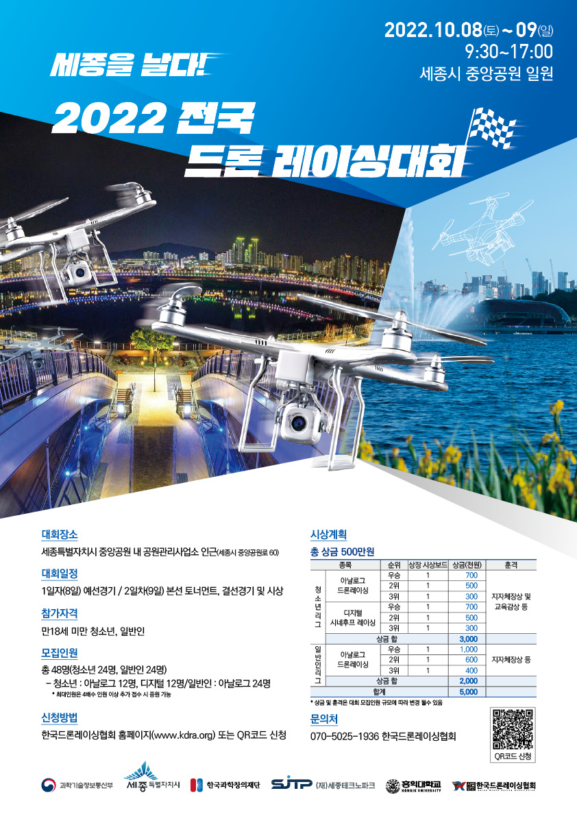 [세종타임즈] 세종특별자치시가 오는 10월 8일부터 9일까지 이틀간 중앙공원에서 ‘세종을 날다!’라는 주제로 ‘2022 전국 드론레이싱 대회’를 개최한다.