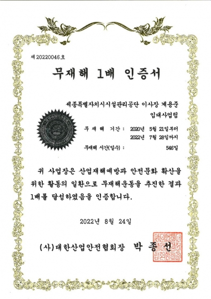 계용준 이사장은 “이번 인증은 산업재해 예방에 관한 공단의 꾸준한 관심과 노력의 결과”며 “앞으로도 체계적인 시설 관리 활동을 통해 무재해를 유지할 수 있도록 시설 유지 관리에 만전을 다하겠다”고 말했다.