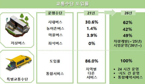 - 대중교통 이용이 제한되는 비도시지역 중심으로 특별교통수단 법정대수 상향과 병행해 ‘21년 86%였던법정 운영대수를 ’26년까지 100%까지 달성해 서비스를 확대한다.