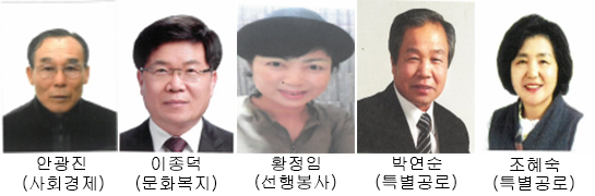 괴산군민 대상 수상자에는 사회경제부문에 장연면 안광진 씨, 문화복지부문에 괴산읍 이종덕 씨, 선행봉사부문에 괴산읍 황정임 씨, 특별공로부문에 괴산읍 박연순 씨, 문광면 조혜숙 씨를 선정, 괴산군민대상을 수여한다고 밝혔다.