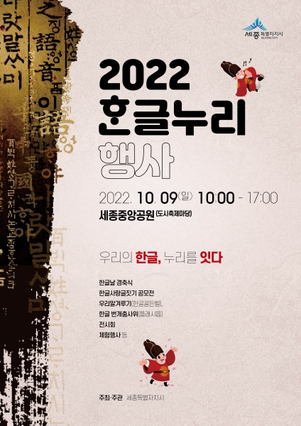 [세종타임즈] ‘한글 도시’ 세종특별자치시가 훈민정음 반포 576돌을 맞아 오는 9일 세종중앙공원 도시축제마당에서 한글날 경축식과 한글누리행사를 개최한다.