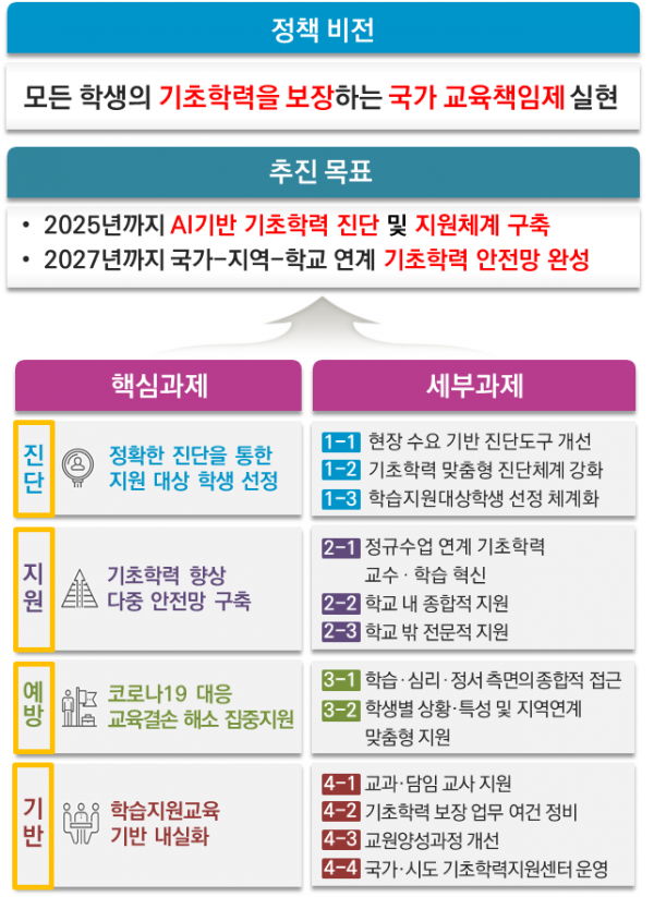 2025년까지 ‘인공지능 기반 학습진단체계’및 ‘국가 기초학력 지원 포털’을 구축해 개인별 수준에 따른 맞춤형 진단을 제공하고 학생·학부모·교사의 사용 편의성을 제고한다.