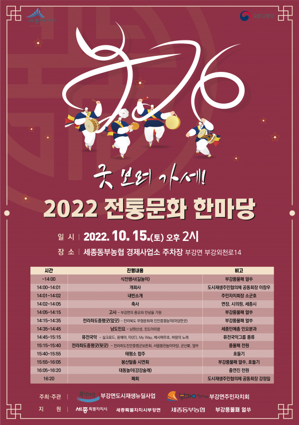 [세종타임즈] 세종특별자치시 부강면 도시재생뉴딜사업 주민협의체와 부강면 주민자치회가 협력해 15일 세종동부농협 앞에서 우리 가락으로 구성된 ‘2022 전통문화 한마당’을 개최한다.