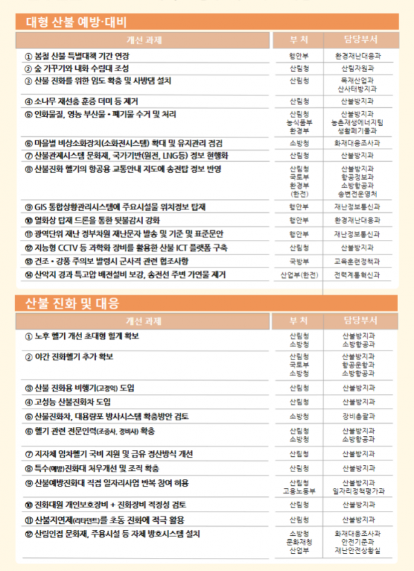 대표 과제는 산불 연중 발생에 대비해 봄철 산불 특별대책기간 연장운영, 산불 진화 헬기와 고성능 진화 차량 등 장비 보강, 산불진화대 확충 및 처우 개선, 원전·문화재 등 주요시설 자체 방어 태세 강화, 산불 진화 임도 확충, 뒷불 감시를 위한 열화상 탐지 드론 보급 등이다.