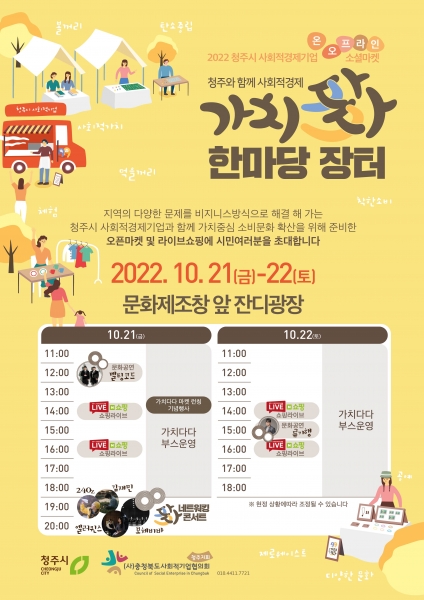 [세종타임즈] 청주시는 오는 21일부터 22일까지 문화제조창 잔디광장에서 ‘제1회 청주시 사회적경제 가치다다 한마당 장터’를 개최한다고 18일 밝혔다.
