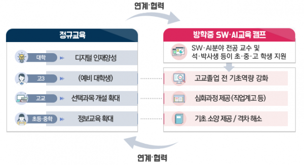 전국 단위로 처음 실시되는 이번 겨울방학 소프트웨어·인공지능 교육 캠프는 올해 12월 겨울방학부터 2023년 2월까지 운영될 계획이며 교육부는 10만명 내외의 학생들이 참여할 것으로 기대하고 있다.