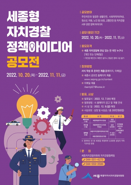[세종타임즈] 세종특별자치시자치경찰위원회가 지역밀착형 자치경찰 시책발굴과 세종자치경찰에 대한 대국민 홍보를 위해 ‘세종형 자치경찰 정책아이디어 공모전’을 20일부터 11월 11일까지 개최한다.