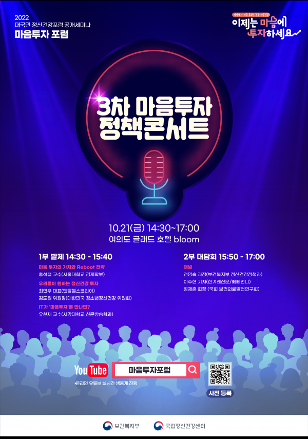 이번 제3차 마음투자정책콘서트는 1부 발제와 2부 대담회로 진행되며 정신건강에 더 많은 관심과 지원이 필요하다는 메시지를 전달한다.