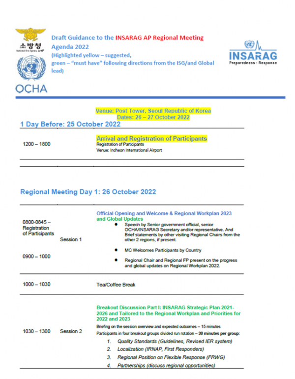 특히 UN INSARAG의 4대 전략과제인 Quailty Standards, Localization, Regional Position on Flexible Response, Partnerships에 대해 분임 토의를 진행해 다양한 의견을 이끌어 낼 계획이라고 전했다.