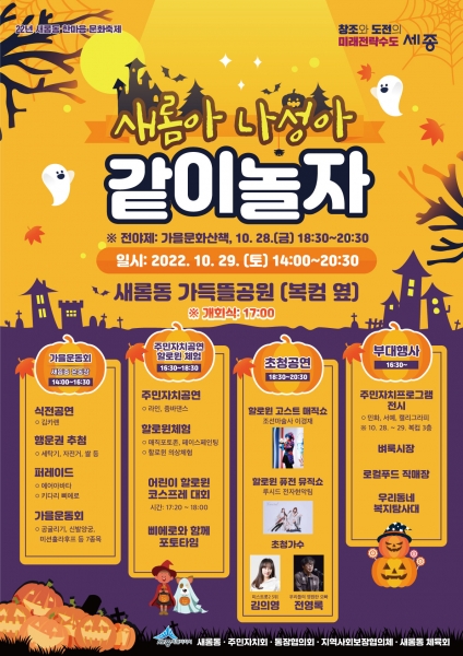 이어 20시 30분까지 가득뜰 근린공원에서 진행하는 문화나눔축제는 어린이 할로윈 코스프레 대회, 할로윈 고스트 매직쇼, 퓨전 뮤직쇼는 물론, 가수 김의영·전영록 초청공연이 진행된다.