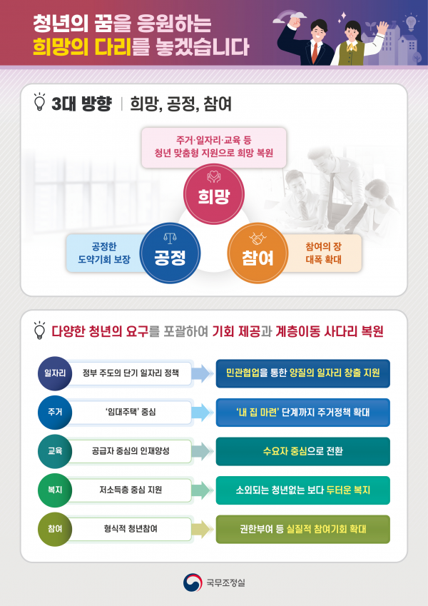 정부는 희망·공정·참여 3대 정책기조 아래 청년에게 다양한 기회를 제공하고 계층이동 사다리를 복원하고자 한다.