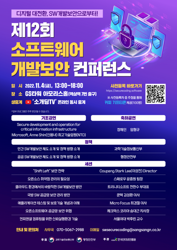 이와 함께 기업의 소프트웨어개발보안 적용 모범사례 공모전과예비 개발자인 대학생 대상의 소프트웨어개발보안 경진대회의 시상 및 발표도 예정되어 있다.