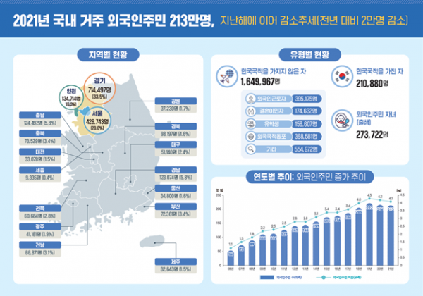 통계청 ‘2021년 인구주택총조사’ 자료를 활용해 분석한 이번 현황자료에 따르면 2021년 11월1일 기준 국내 거주 외국인주민 수는 213만4,569명으로 전년 대비 2만1,848명이 감소했다.