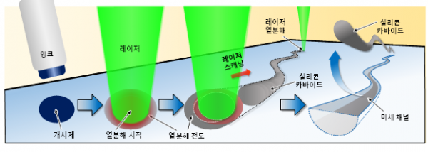 연구팀은 불투명한 폴리디메틸실록산이 투명한 폴리디메틸실록산보다 효과적으로 레이저를 흡수해 열분해 반응이 유도될 수 있다는 점에 주목하고 이 열분해 연쇄반응 현상을 이용해 3차원 프린터처럼 원하는 모양을 쉽고 간단하게 만들 수 있는 폴리디메틸실록산 가공법을 개발했다.