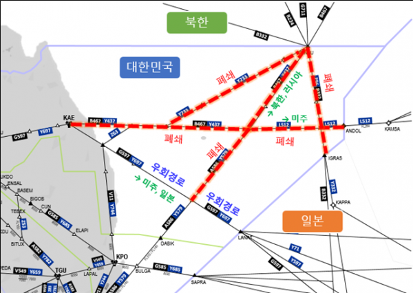 폐쇄하는 항공로 중 북한을 경유하는 항공로를 사용하는 항공사는 없으나, 일본을 경유하는 항공로는 일평균 33대가 사용하고 있어 우회가 불가피하다.