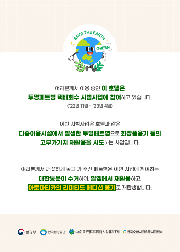 국민들은 호텔 객실을 이용하는 과정에서 제공된 음료 및 생수 투명페트병을 해당 시설 내 전용수거장소에 놓는 것으로 손쉽게 참여할 수 있다.