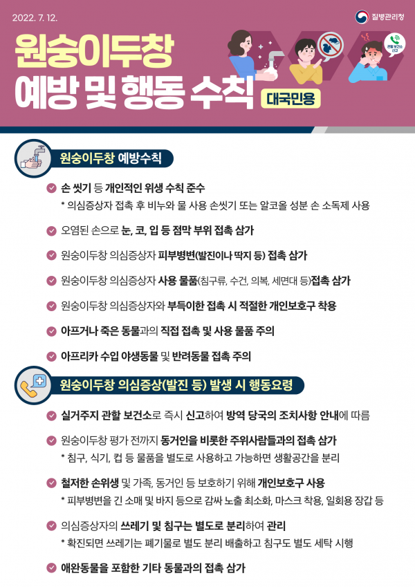 백경란 질병관리청장은 “현재 국내에는 원숭이두창 환자가 없고 지금의 방역 대응 역량으로 관리가 가능하나, 해외 유입 가능성이 상존하는 만큼 해외동향 파악 및 감시를 철저히 할 예정이다”고 밝히면서 국민에게는 “발생국가 방문 또는 여행 시 개인위생수칙을 준수하고 귀국 후 21이내 증상 발생 시 1339로 상담해줄 것”과, 의료진에 대해서는 “원숭이두창 의심환자를 진료할 때 안전한 보호구를 착용하고 환자 감시와 신고에 적극적으로 협력해 줄 것”을 당부했다.