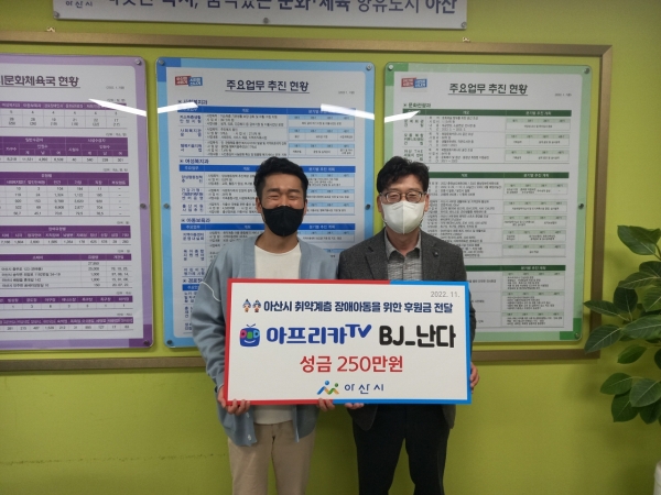 [세종타임즈] 아프리카TV 게임방송 BJ로 활동하고 있는 닉네임 난다가 지난 3일 아산시에 취약계층 장애아동 지원을 위한 후원금 250만원을 전달했다.