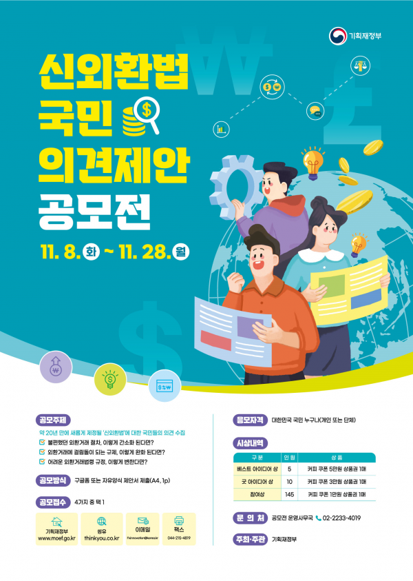[세종타임즈] 기획재정부는 외환제도 전면개편 작업을 추진하면서 국민들이 외환거래시 현장에서 경험하는 불편·애로사항을 듣고 개선과제를 발굴하기 위해 ‘22.11.8일부터 3주간 ‘신외환법 국민 의견제안 공모전’을 개최한다.