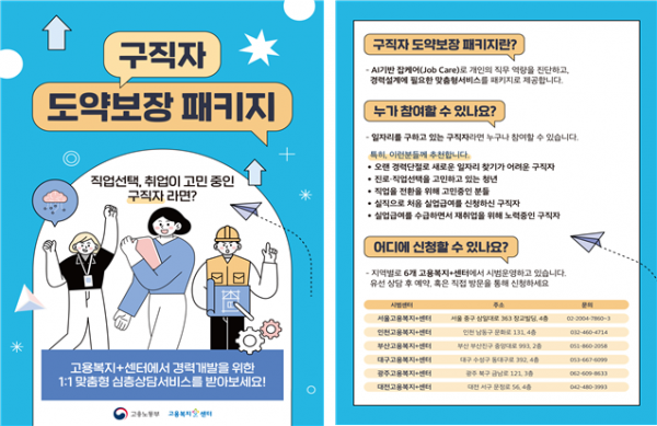 구직자 도약보장 패키지는 구직자의 경력개발단계, 구직애로 유형 등에 따른 “진단심층경력설계맞춤형 취업지원”을 패키지로 제공하는 사업으로 올해 8월 19일부터 서울, 인천, 부산, 대구, 광주, 대전고용센터에서 시범 운영하고 있다.
