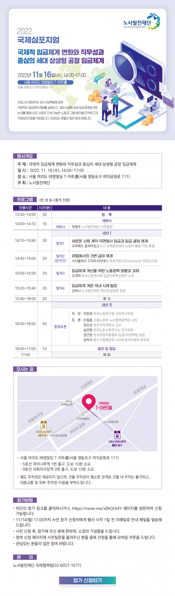 [세종타임즈] 노사발전재단은 오는 11월 16일 수요일 서울 여의도 태영빌딩 T-아트홀에서 국내외 기업 최고경영자 및 인사노무 담당자와 임금체계에 관심이 있는 일반인들을 대상으로 상생형 공정 임금체계 모색을 위한 국제 심포지엄을 개최한다.