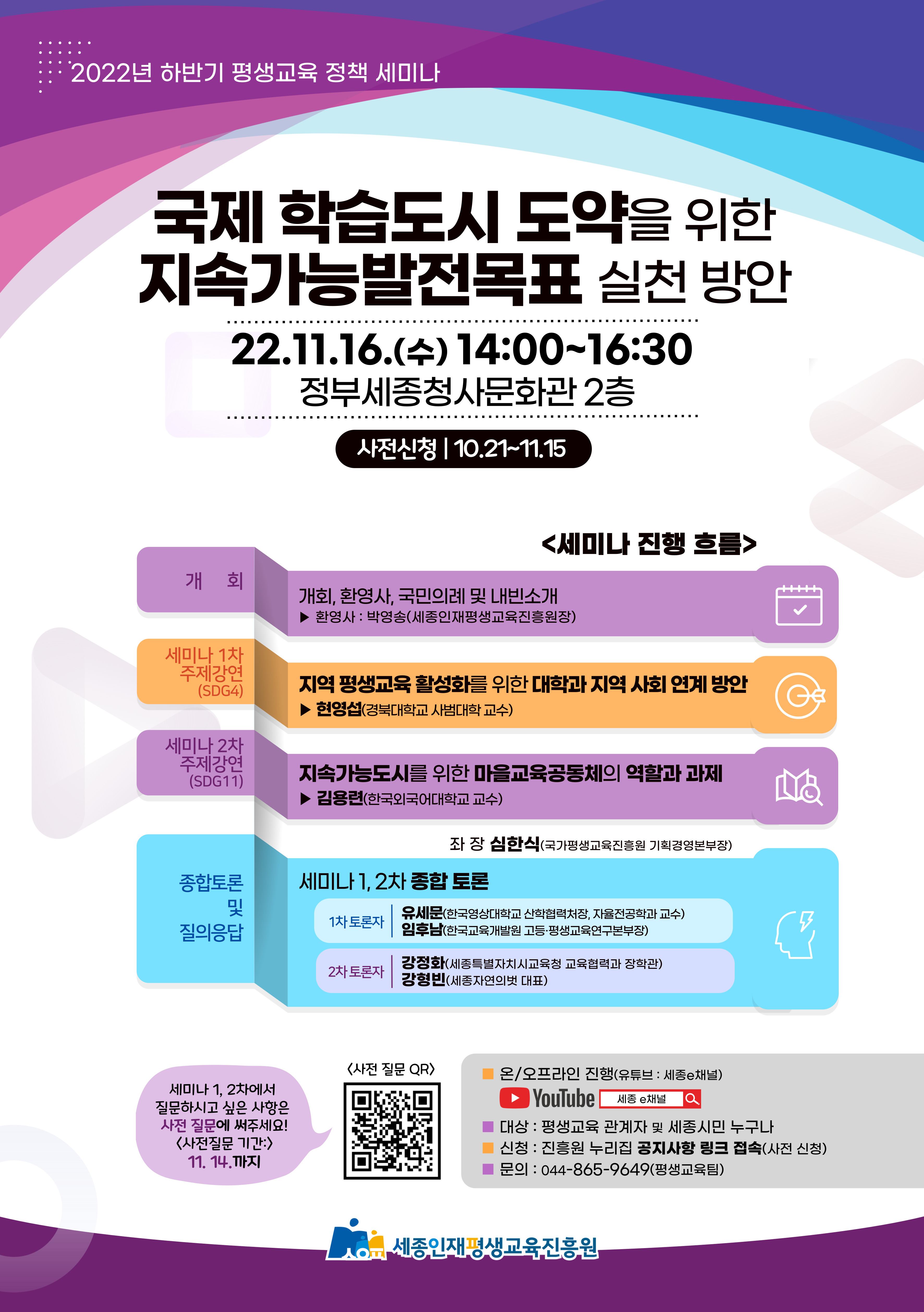 [세종타임즈] (재)세종인재평생교육진흥원이 11월 16일 정부세종청사문화관에서 평생교육 관계자 및 세종시민을 대상으로 “국제적 학습도시 도약을 위한 지속가능발전목표 실현 방안”이라는 주제로 하반기 평생교육 정책 세미나를 개최한다.