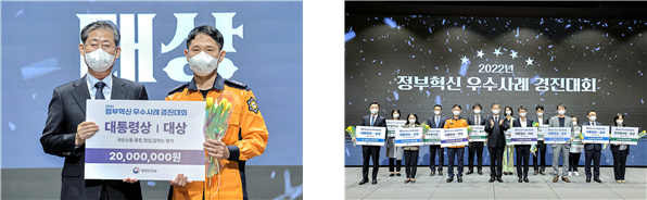 [세종타임즈] 소방청은 지난 9일 행정안전부 주관‘2022 정부혁신 우수사례 경진대회’에 출전한‘척 하면 삼천리 똑똑한 119 AI 신고접수 체계’가‘국민소통·통합, 협업, 일하는 방식’분야에서 대상을 수상했다고 밝혔다.