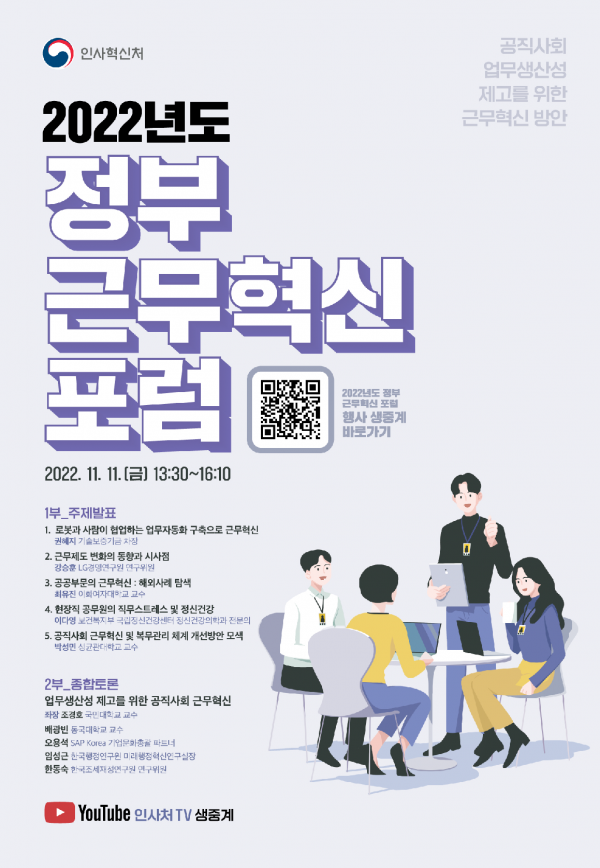디지털 대전환, 원격근무 확산 등 업무 환경 변화에 대응한 근무방식 개선 사례, 현장 공무원의 정신적 스트레스 방지를 위한 정책 제언 등 전문가의 발제에 이어 업무 생산성 제고를 위한 공직사회 근무혁신 방향을 모색하는 종합토론으로 진행됐다.