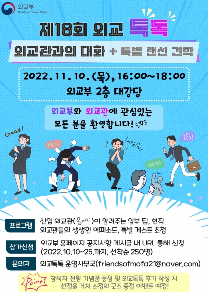 외교부가 매년 2차례 개최하는 ‘외교톡톡’행사는 외교부 공식 청년기자단 ‘모파랑’이 직접 사회를 맡고 기획에 참여하며 올해 하반기로 18회차를 맞이했다.