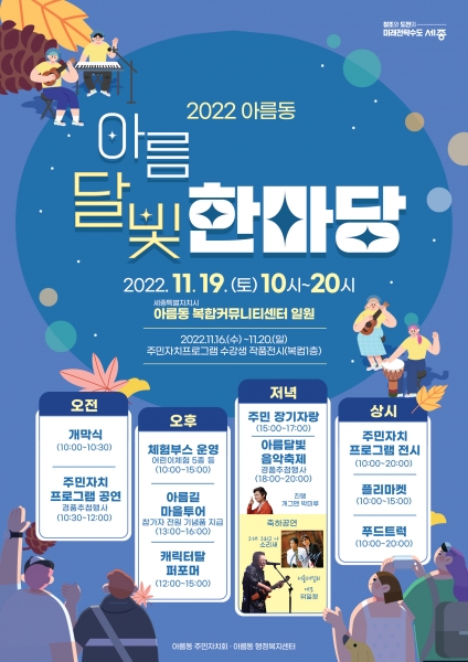 [세종타임즈] 세종특별자치시 아름동과 아름동주민자치회가 오는 19일 아름동 복합커뮤니티센터에서 개막식을 시작으로 아름동 최대 축제 ‘아름달빛 한마당’을 연다.