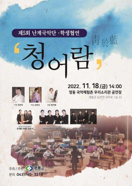 영동군은 차세대를 이끌어 갈 젊은 인재 발굴 및 공연 기회를 제공하고자 제5회 영동군 난계국악단과 학생 협연 ‘청어람’을 오는 11월 18일 오후 2시에 영동국악체험촌 우리소리관 공연장에서 개최한다고 밝혔다.