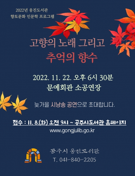 이번 시낭송 공연은 웅진도서관 공모사업의 일환으로 8월부터 운영 중인 향토문화인문학 프로그램 ‘낭송의 힘’ 시낭송반 수업에 참여했던 수강생들과 함께 준비했다.