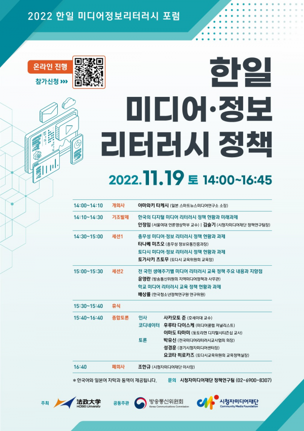 방송통신위원회와 시청자미디어재단은 11월 19일 일본 호세이대학이 주최하고 총무성과 토다시 교육위원회 등이 함께하는‘2022 한일 미디어·정보리터러시 포럼’에 참석했다.