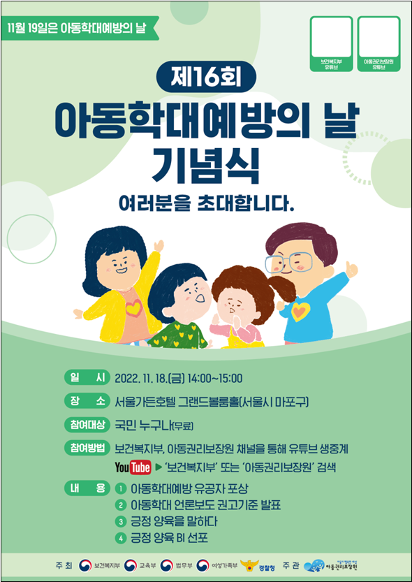아울러 “국민 여러분께서도 아동을 존중받아야 할 독립적 인격체로 인식하고 긍정적인 방식의 아동양육에 함께해 주시길 희망한다”고 밝혔다.
