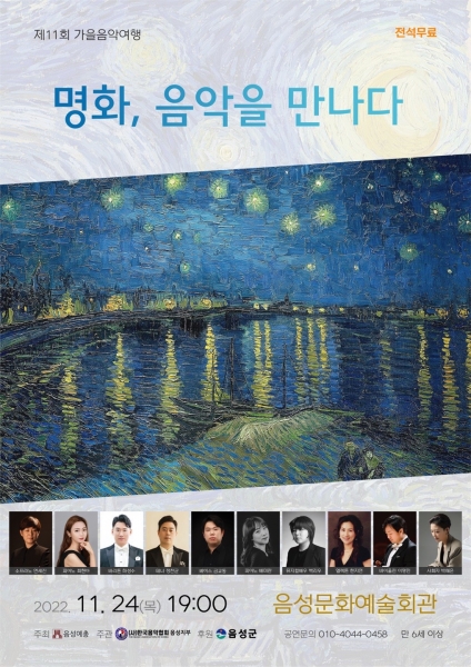 특히 세계적으로 유명한 명화 작품을 다양한 장르의 음악과 함께 선보여 군민들이 친숙하게 즐길 수 있는 공연으로 구성했으며 음성 지역 합창단인 ‘성악앙상블 루바토’의 아름다운 음성이 더해져 관객들에게 가을의 정취에 어울리는 감동을 선사할 것으로 기대를 모으고 있다.