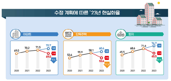 `23년 공시가격에 적용될 유형별 평균 현실화율은 수정된 계획에 따라`20년 수준인 공동주택 69.0%, 단독주택 53.6%, 토지 65.5%로 감소한다.